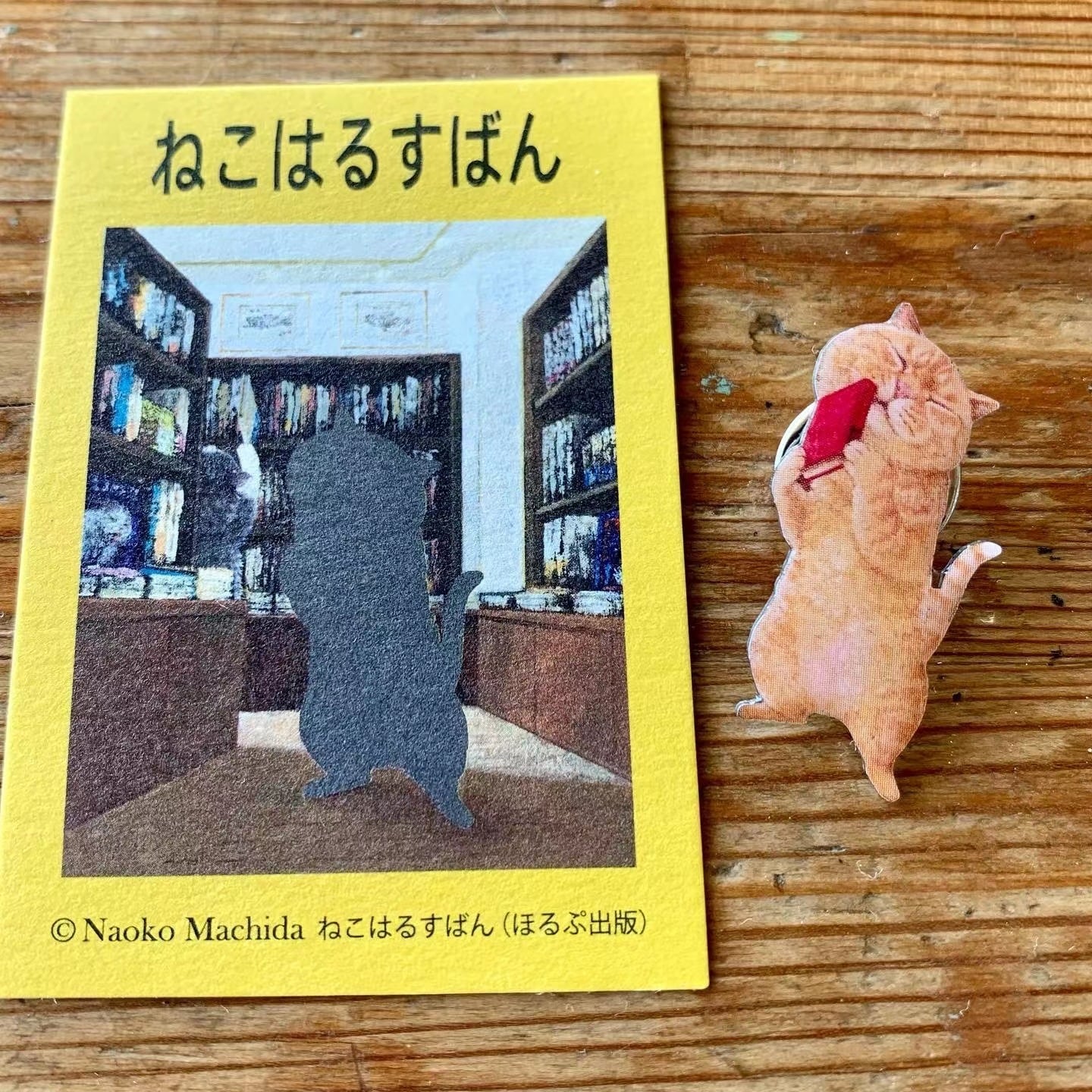 町田尚子『ねこはるすばん』より飛び出した、本にすりすりする茶トラ猫さんのピンバッジです!